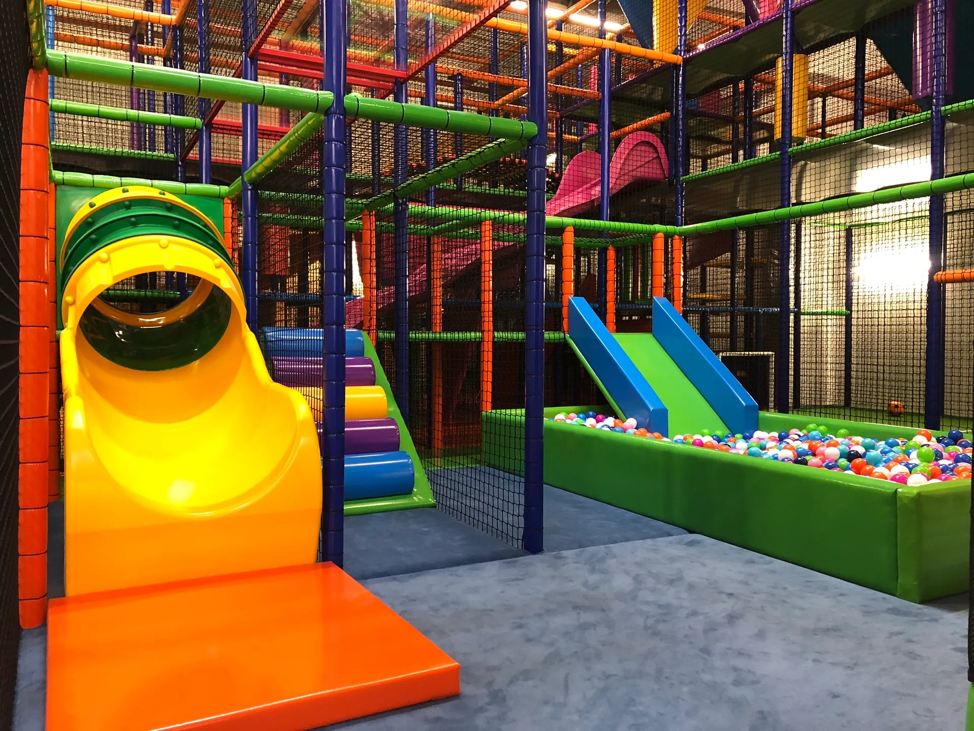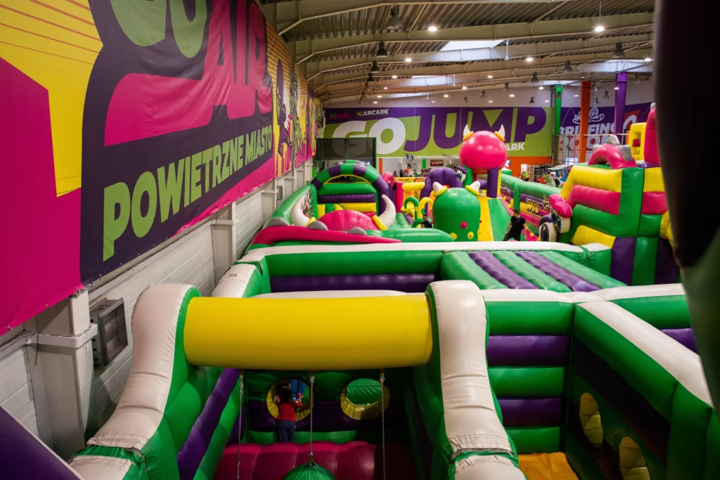 Całoroczna sala zabaw z trampolinami, zjeżdżalniami i basenami z piłeczkami.