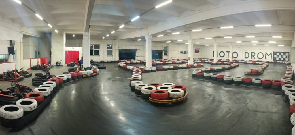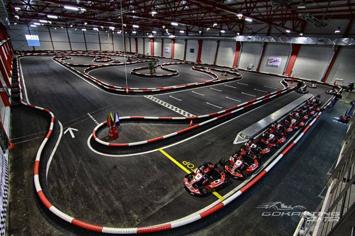 Tor gokartowy z możliwością jazdy wewnątrz i na zewnątrz.
