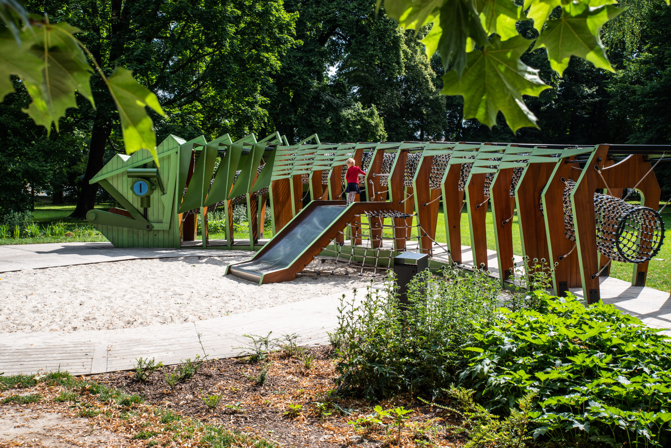 Plac zabaw położony w malowniczym parku na Podgórzu.
