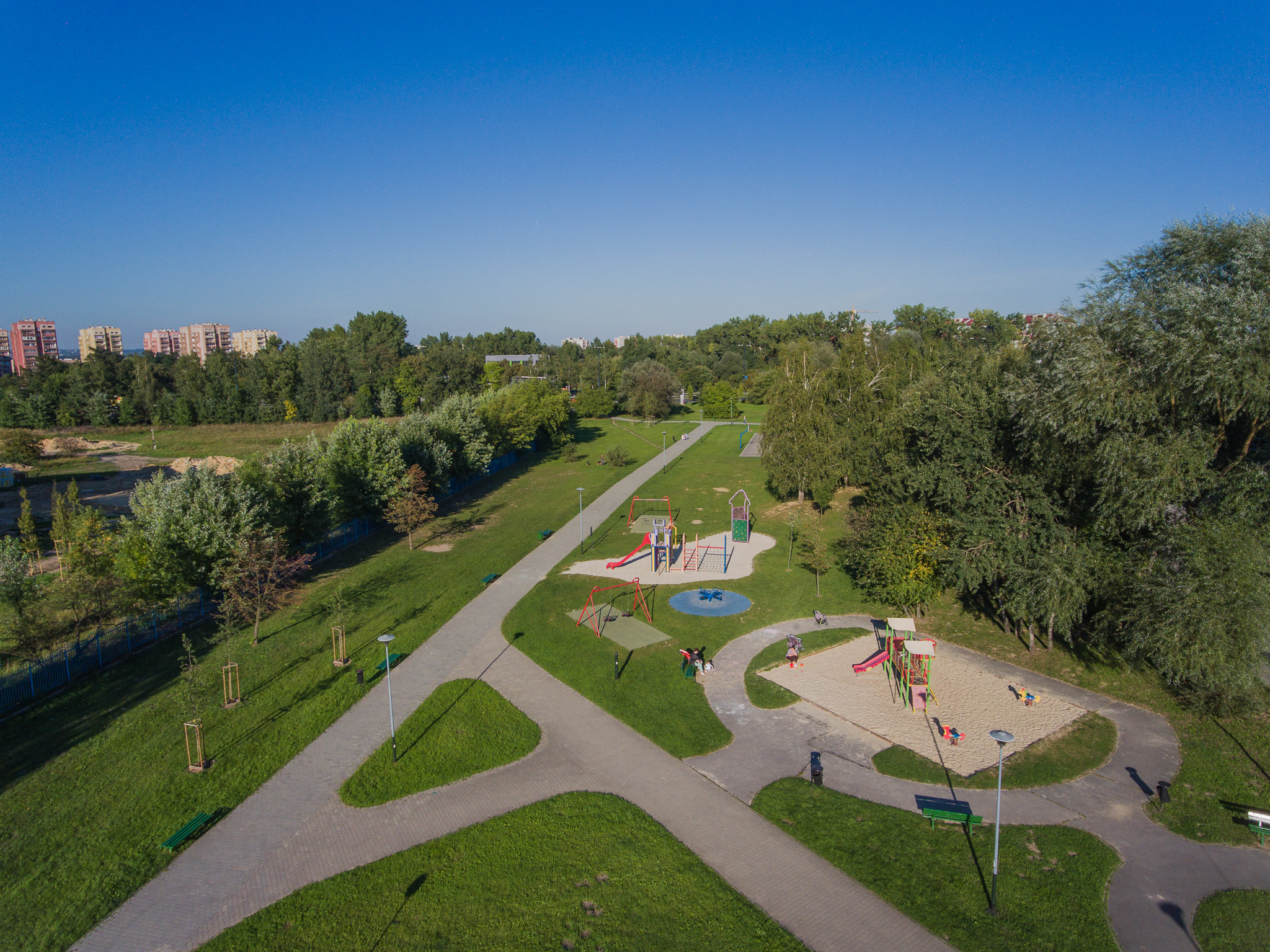 Nowoczesna przestrzeń rekreacyjna z dużym placem zabaw.