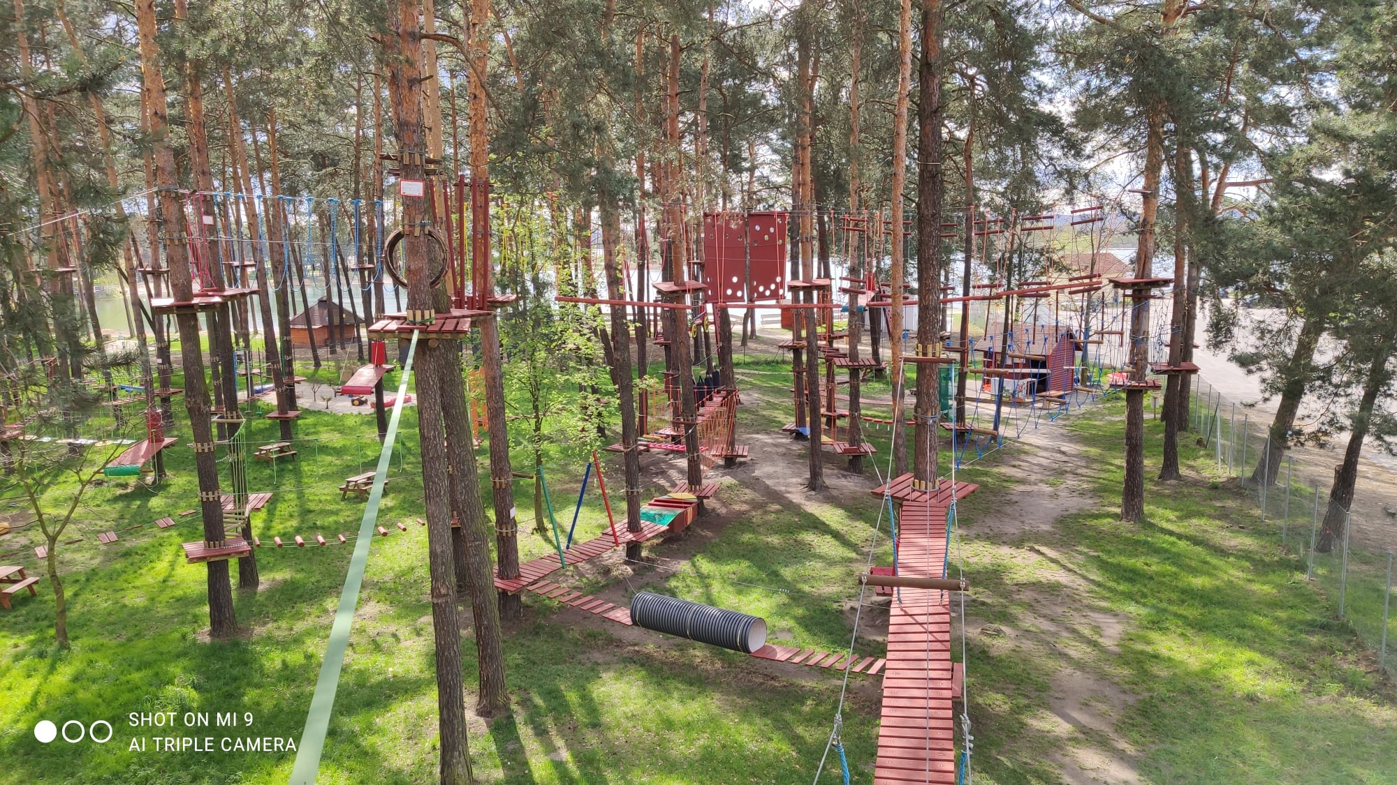 Park rekreacyjny z elementami linowymi i placem zabaw dla dzieci.