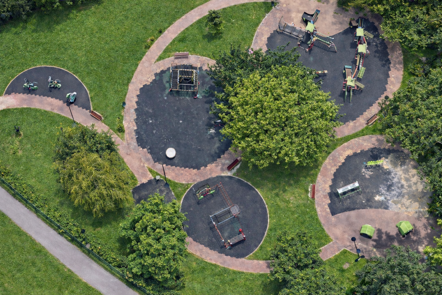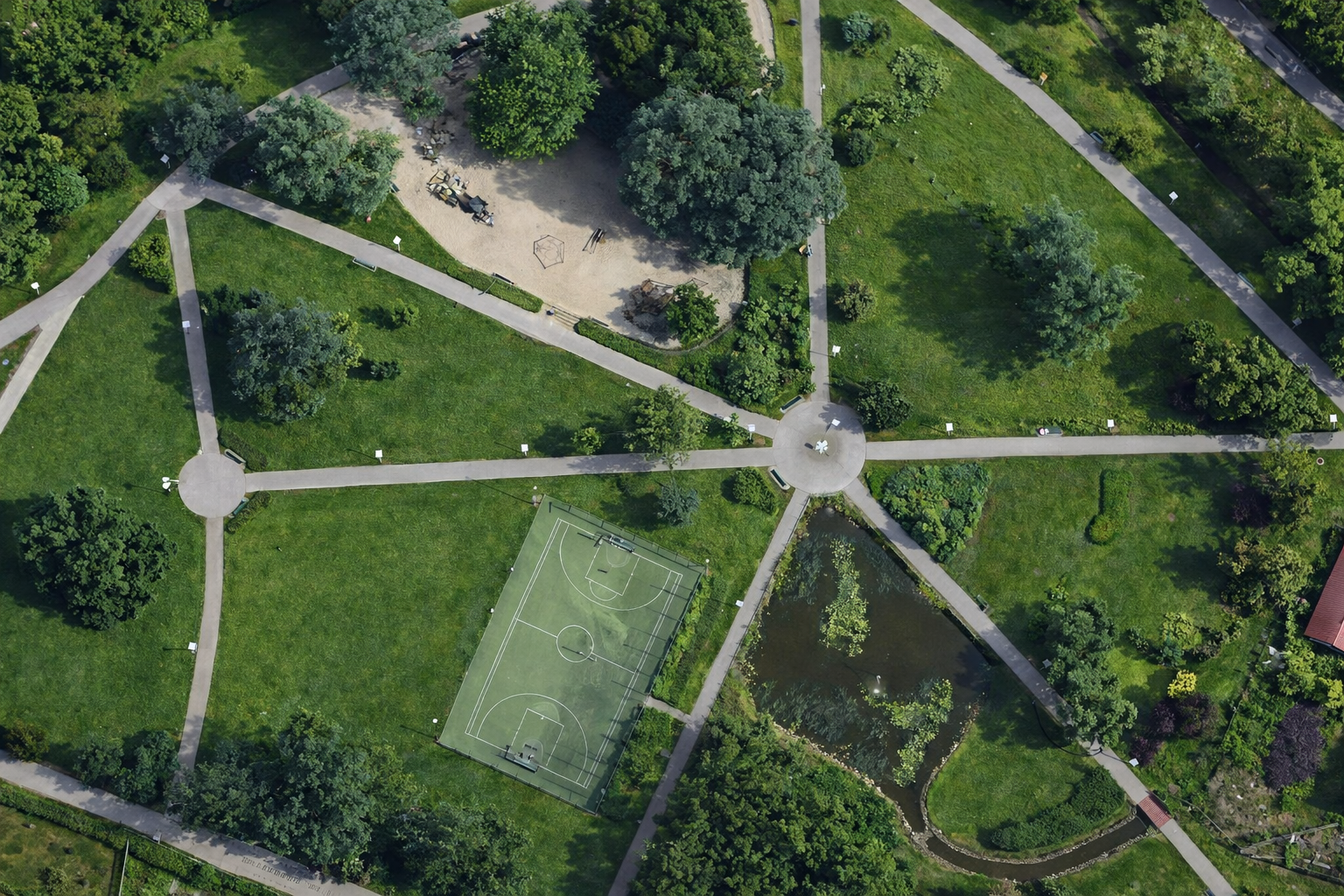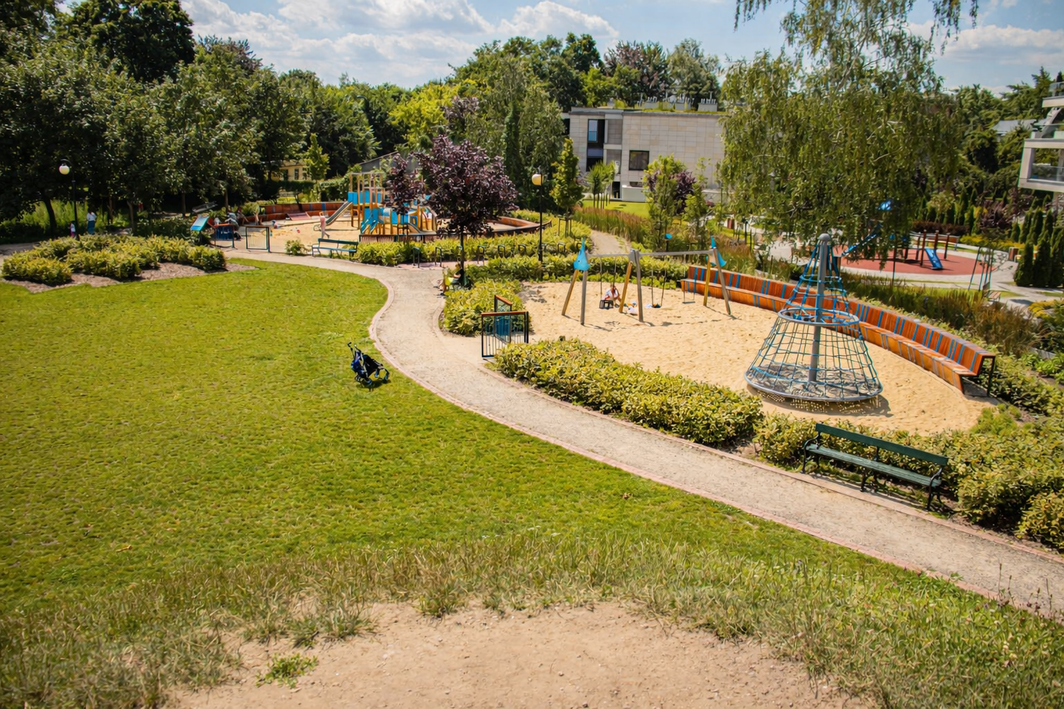 Nowoczesny park z dużym placem zabaw i przestrzenią rekreacyjną.