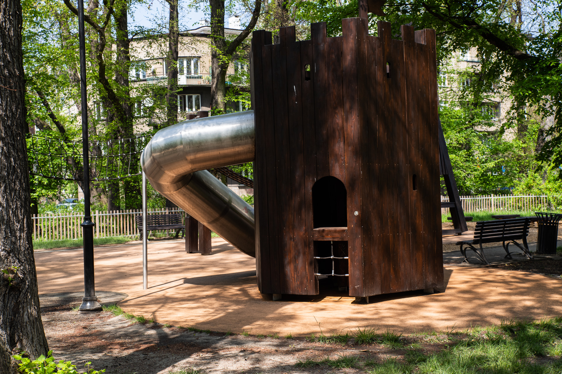 Plac zabaw w zielonej okolicy.